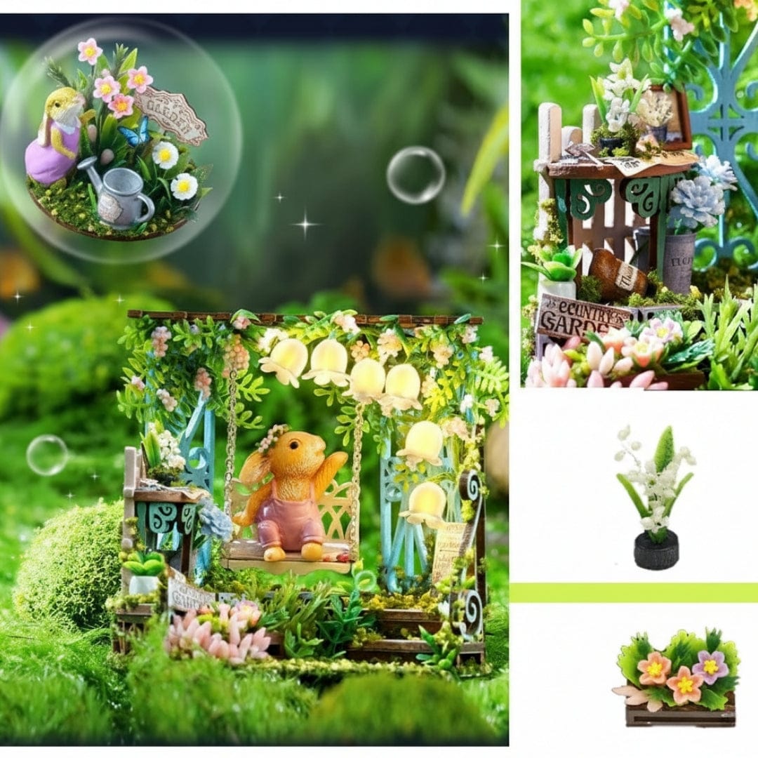 Dans ce Book Nook Fairytale Garden, on découvre un petit lapin assis sur une balançoire en bois, suspendue entre des branches couvertes de fleurs. Le sol est traversé par de fins chemins entourés de végétation, avec des plantes et des fleurs disposées tout autour de la scène. L’ensemble forme un jardin miniature fantastique dans un décor réaliste.